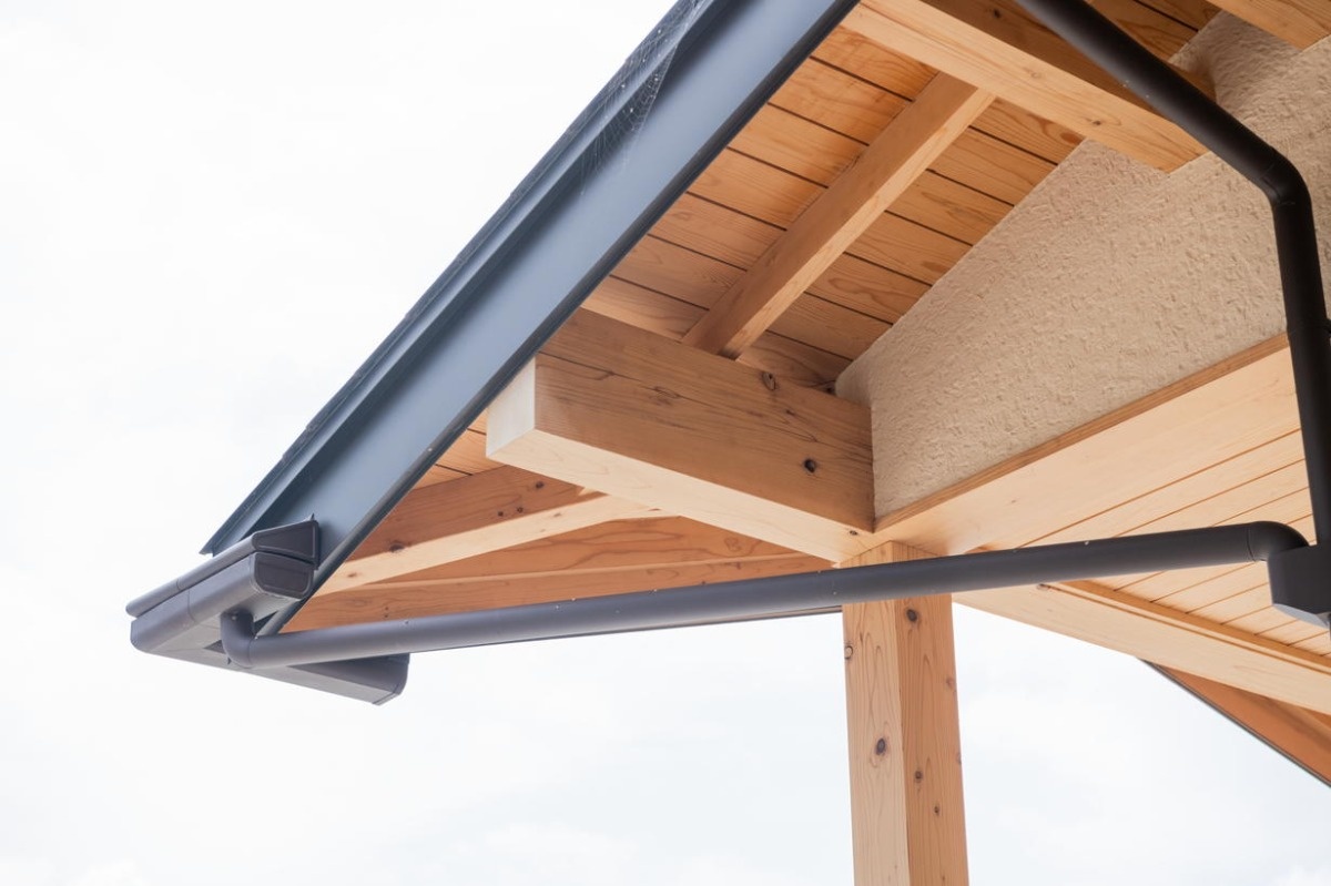 外観にもちょっとした工夫が見られます。外壁は美しさと耐久性の評価が高い塗り壁、右側の軒先には、見えるように古材の梁をわたしています。伝統的な建築の中にもモダンでスマートな要素を取り入れた外観に仕上がりました。