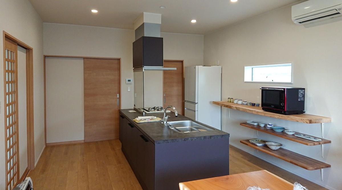 アイランドキッチンの背後の棚はオープンタイプにしました。「夫婦ともに、お皿を見に行ったり集めたりするのが好き」と奥さま。お気に入りのお皿のディスプレイを楽しめ、使う時には取り出しやすさも抜群です。