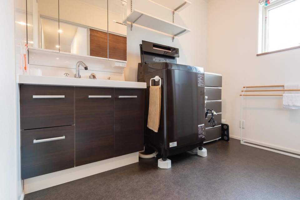 明るくゆとりのある洗面・脱衣室。洗濯機の上には可動棚を造作し、洗剤や小物類などが置けるようになっています。