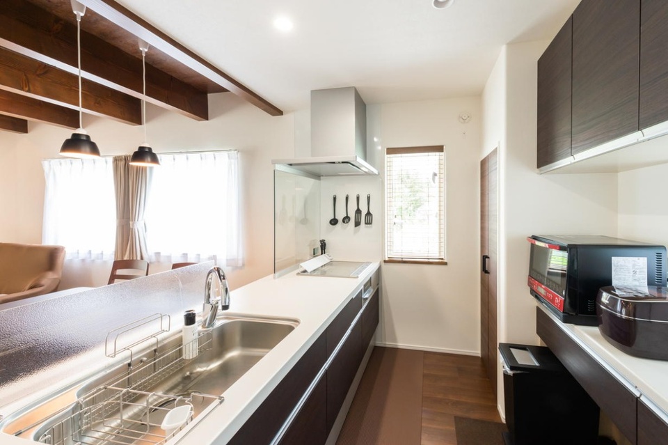 オール電化住宅で、キッチンにはIHクッキングヒーターを採用しました。背面にはパントリーや収納も完備されていて、電子レンジや炊飯器もきれいに収まっています。