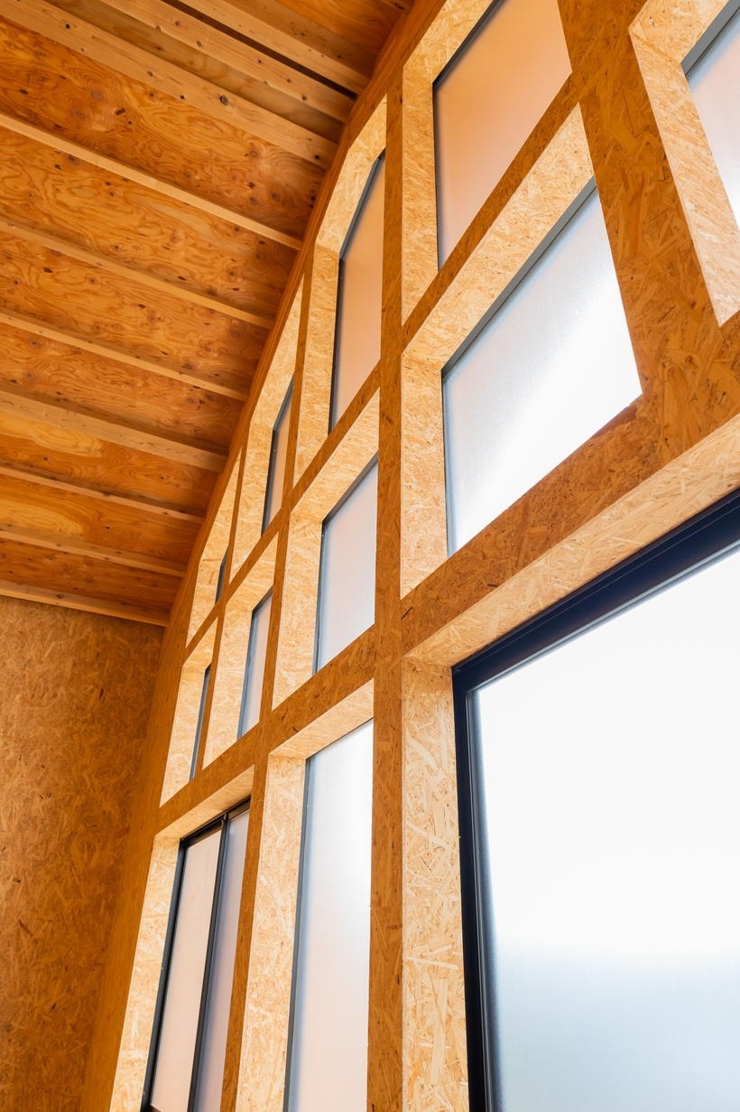 構造材には、地元の木工場で製材した国産杉の無垢材を使用しています。こうした素材選びも村上工務店のこだわりのひとつ。窓枠部分はOSBで化粧しています。