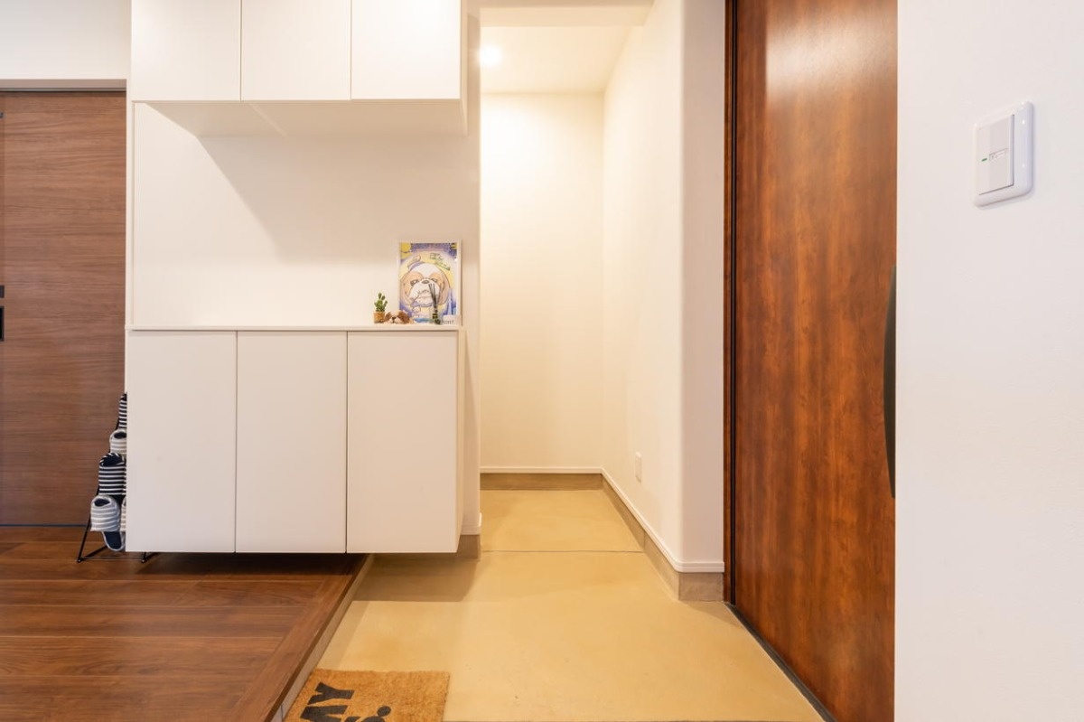 カウンター付き玄関収納の上では、ぽんちゃんの似顔絵とぬいぐるみが来客をお出迎え。その奥には大きなシューズクロークを備えており、玄関はいつもスッキリしています。