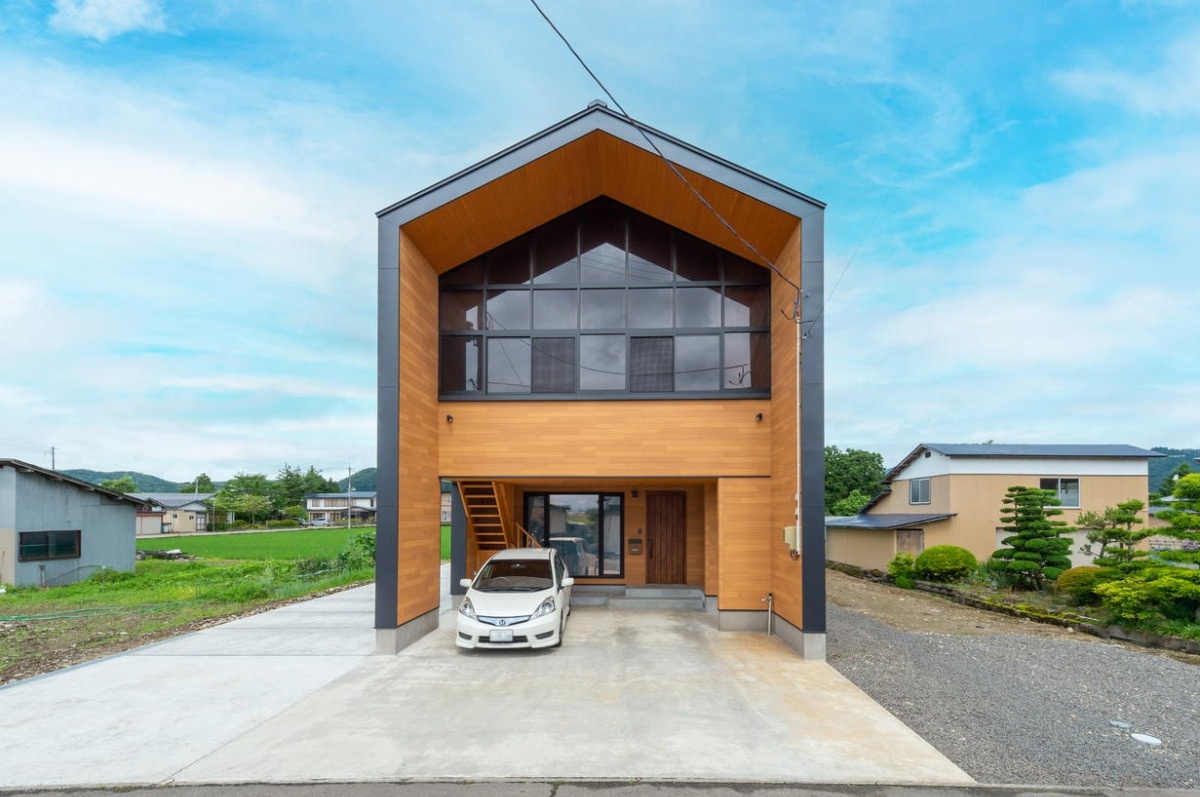 秋田県大仙市内の田園が広がるのどかなエリア。ひときわ映えるモダンな外観の家がK邸です。
