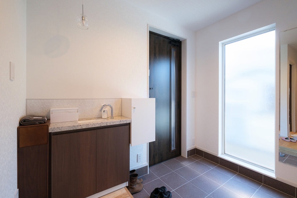 摺りガラス入りの大きな窓がある明るい雰囲気の玄関ホール。新型コロナ感染症やインフルエンザ予防のため手洗い用の小さな洗面台を造作しました。