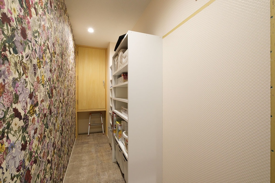買い物の回数を減らすため、キッチンの裏に大型のパントリーを配置。南欧調のアクセントクロスで遊び心を取り入れました。