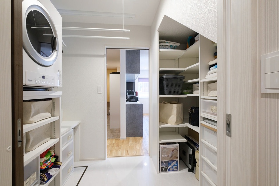 階段下のデッドスペースを利用したファミリークローゼットとカウンターがあり、洗濯物の振り分け・アイロンかけ・畳み・収納―という一連の作業が1室で完了します。