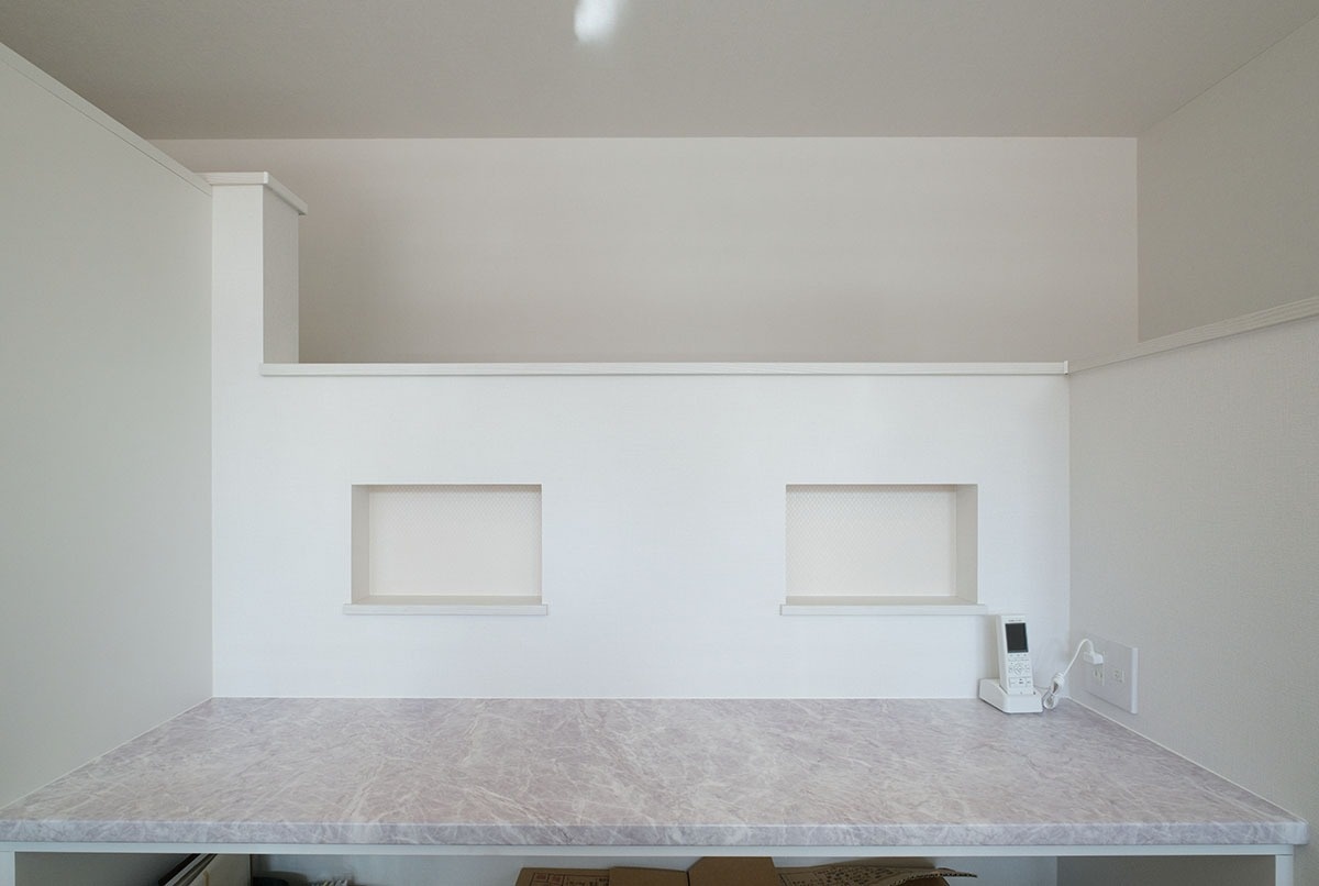 階段の降り口と書棚の間にあるゆったりしたワークスペース。文房具や小物が置けるニッチとコンセントがついています。