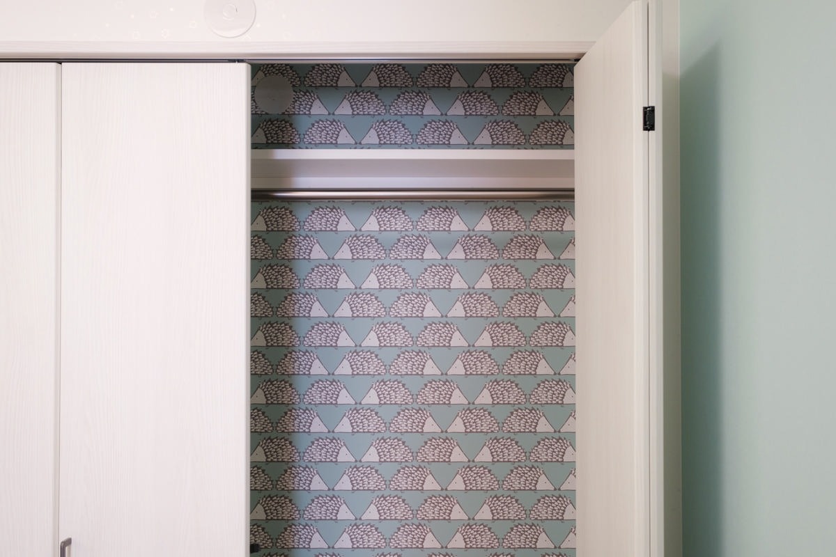 クローゼット内部は可愛い動物柄や花柄のクロスで仕上げました。