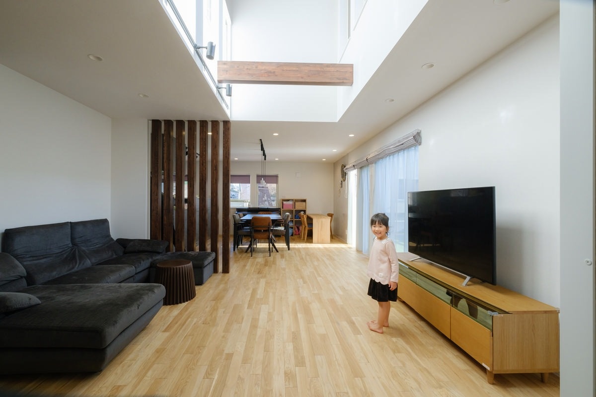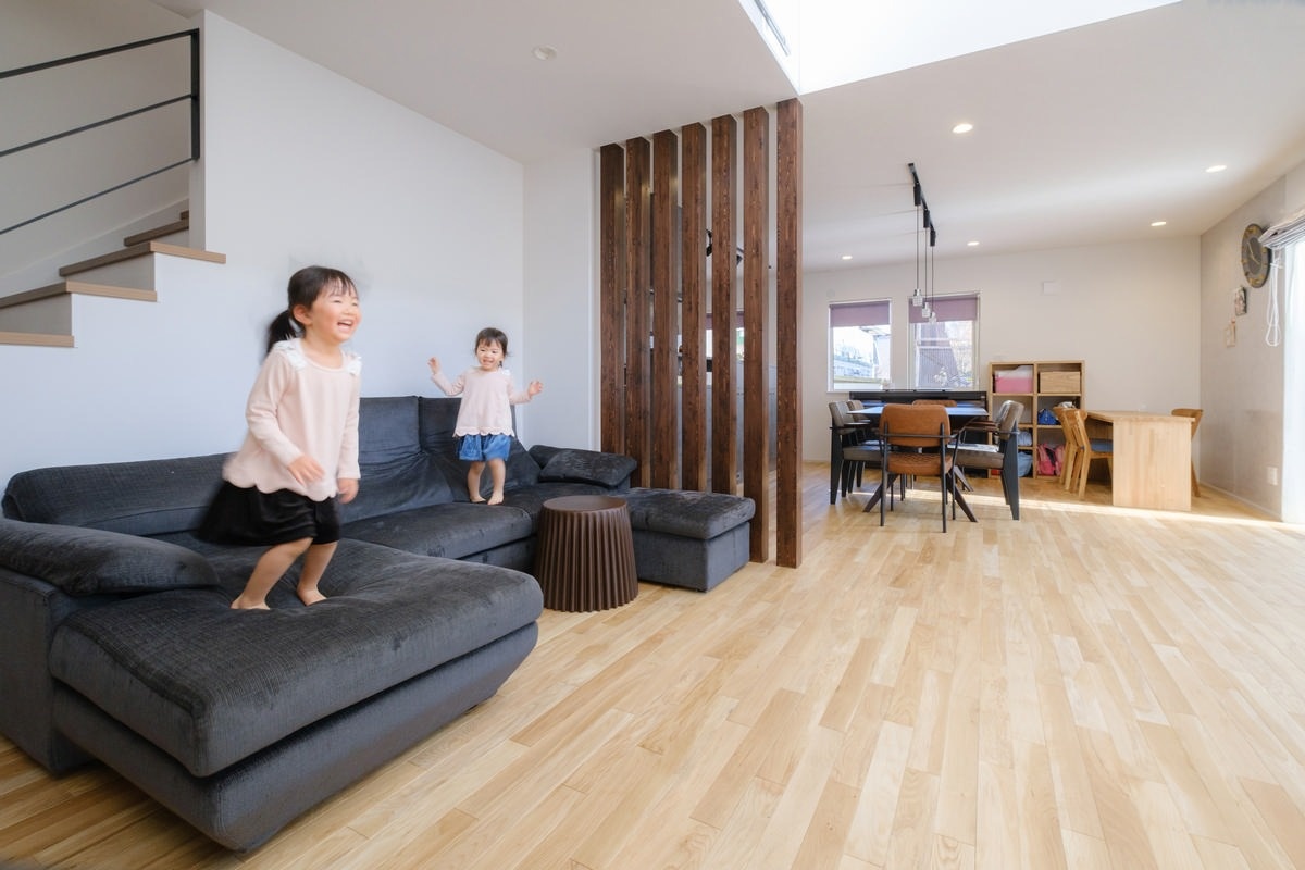 奥さま「リビングの端からダイニングの端までの直線距離が長く、子供たちが勢いよく走っても安心です。日ごとに活発になっていく娘たちを穏やかに見守れるようになりました」。