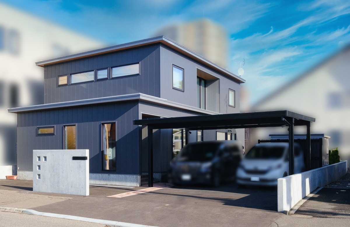 車2台を横並びに停められる屋根付きのカーポートと1台分の駐車スペースを備えたモダンなお住まいです。