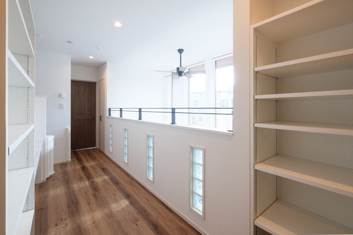 吹き抜けを見下ろす2階・ホール。Hさんご夫妻が仕事で使う資料やお子さまの本がタップリ入る大きめの書棚を2ヵ所に造り付けています。