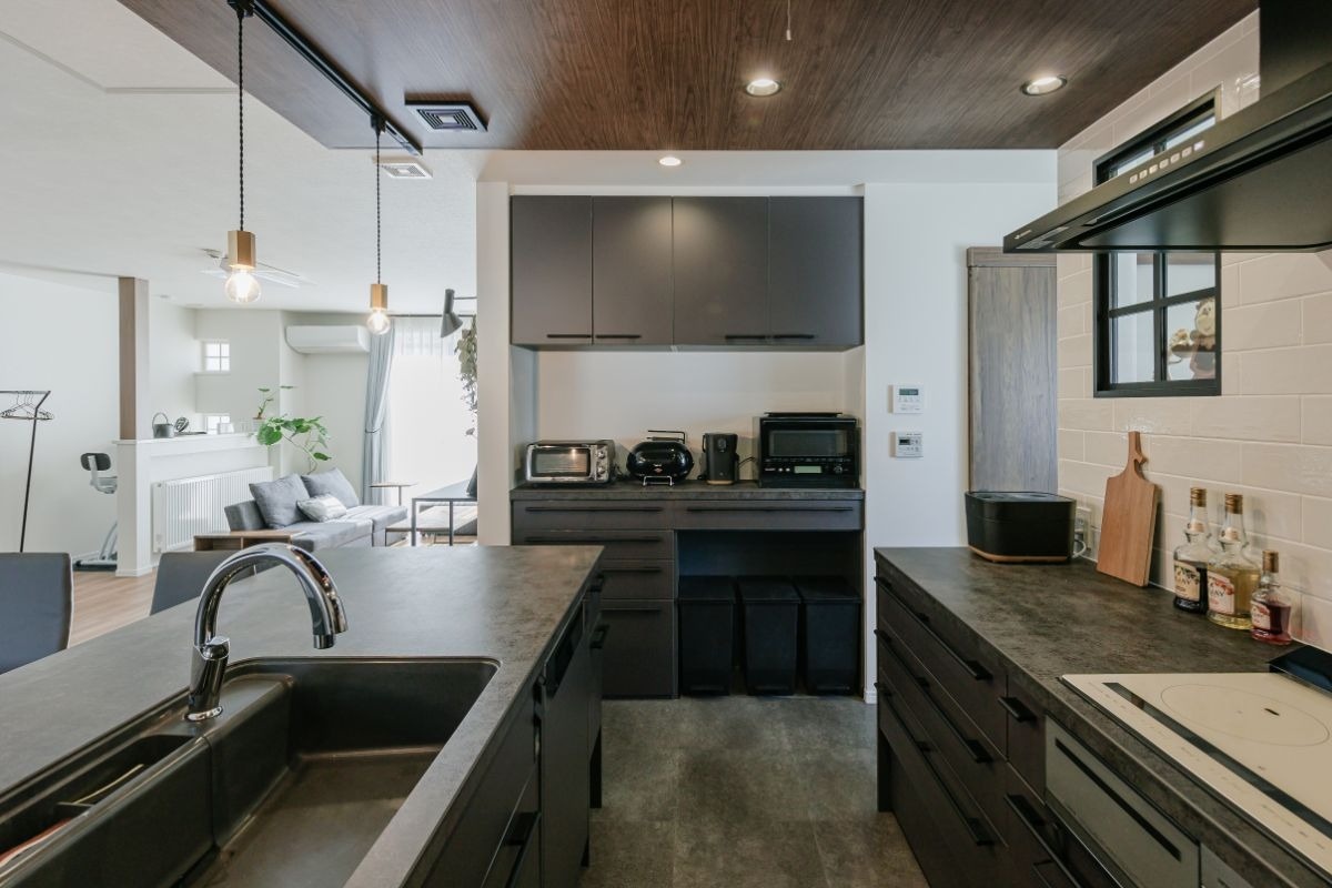 「視線の奥に暗い色を持ってくると空間が広く見えると聞いて」と、天井はダーク系の木目クロスを使った下がり天井に。床には濃い石目のデザインを合わせ、黒いキッチンと一体感のある空間に仕上げました。