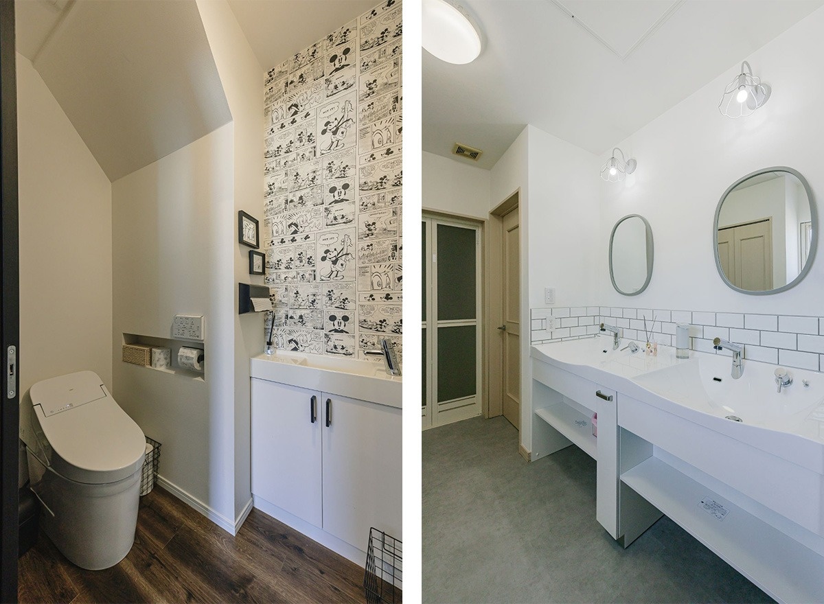 壁の位置を変え広々とした造りに。腰壁やニッチの作り棚は造作です。白いサブウェイタイルで、シンプルな空間に好みのブルックリンスタイルを取り入れました。