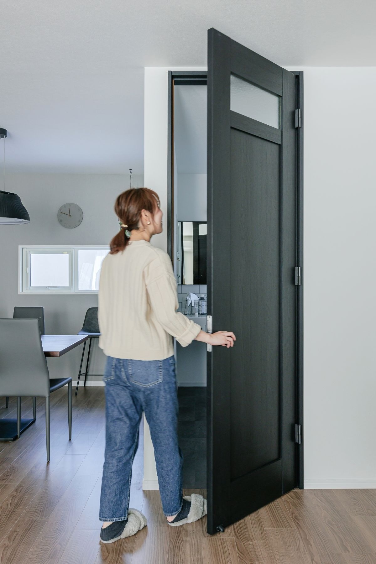 「オンラインミーティングをする時に背景を可愛くしたくて」(奥様)と、背後のドアのデザインにもこだわりました。