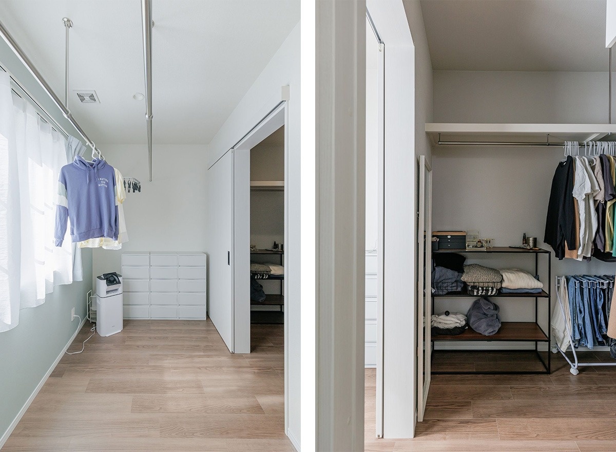 寝室だった部屋はPCスペースの他、5人分の洗濯物も余裕で干せるサンルーム(写真左)とクローゼット(写真右)に。専用スペースを用意したので洗濯物が人目に触れず、室内をいつでも美しく保つことができます。