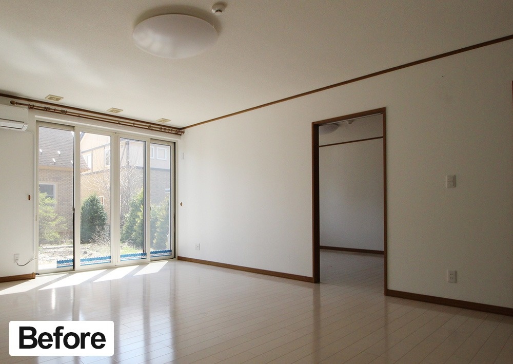 リフォーム前のリビングです。今回は、基礎、外壁、屋根、断熱などの主要構造部や設備などを、ティーメイスの本間智代里社長が現況調査、図面チェックなどを行った上で、十分使える躯体はそのままに間取りを変更、キッチンや風呂など設備の入れ替えと内装が中心のリフォームです。元はリビングと寝室だった空間は……