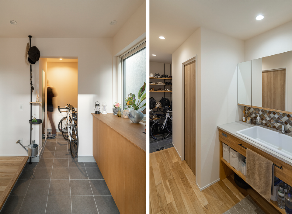たとえば、玄関ドアを開けると長い土間が登場。手前は来客用で直接リビングへ、奥は家族用で洗面スペースを経由してLDKへつながる動線となっています。家族用玄関にはシューズクロークやコート掛けがあり、自転車2台が置けるゆとりも。家に帰ってきて、すぐに洗面スペースで手洗いができるのも衛生的です。