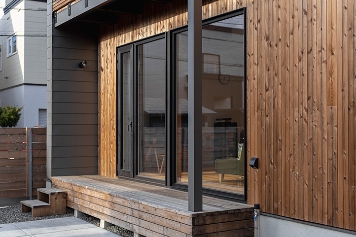 さて、畳を2階に上げることで確保できたウッドデッキは、どのように活用されているのでしょう。建物自体は敷地前の道路からセットバックして建てられているため、正面には広々としたスペースが。ここに2台分の駐車エリアと、コンクリート敷きの前庭が割り当てられました。ウッドデッキは、前庭とリビングをつなぐ縁側のような存在で、リビングのガラス戸を開けてアクセスできます。