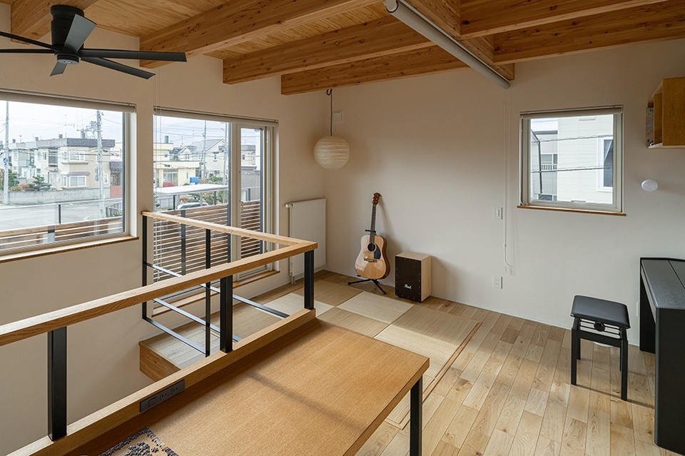 奥に進むと電子ピアノが一体的に置かれ、さらには畳スペースがつながっています。「友人が遊びに来たときには、ここでみんなで演奏を楽しんでいますね」。ご主人はギターやカホン、奥さまはピアノ。隣家のことを気にせず、自在に音を奏でられるのは、戸建て住宅の大きな魅力といえるでしょう。