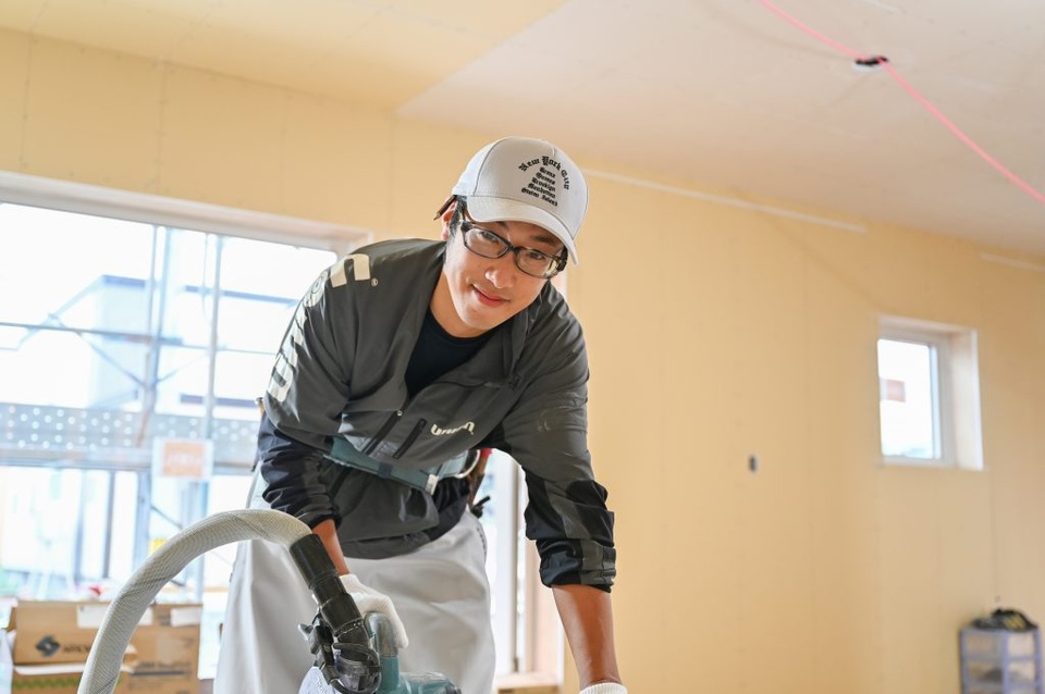 大工の山口康貴が同級生なんです。いつか家を建てるなら康貴に頼むって決めていて。他の住宅会社に頼むとかは一切考えませんでした。小山内建設が断熱性能にこだわっているといった話は知らずに小山内建設に、というか康貴に依頼しました。工事中もジュースの差し入れを持っていって、大工さんと話したり、打合せをしたりしました。