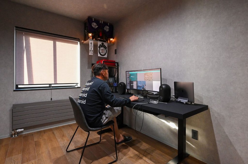 パソコン用の机は、天板を自分で用意して、あとは大工の中井さんに相談して作ってもらいました。中井さんにはシューズクローゼットやパントリー、ダイニングテーブルなども作ってもらいました。中井さんはベテランの大工さんで、とても優しくて、しかも家のデザインに合わせた建具、取手などの選定でもいいアドバイスをたくさんしてくれました。