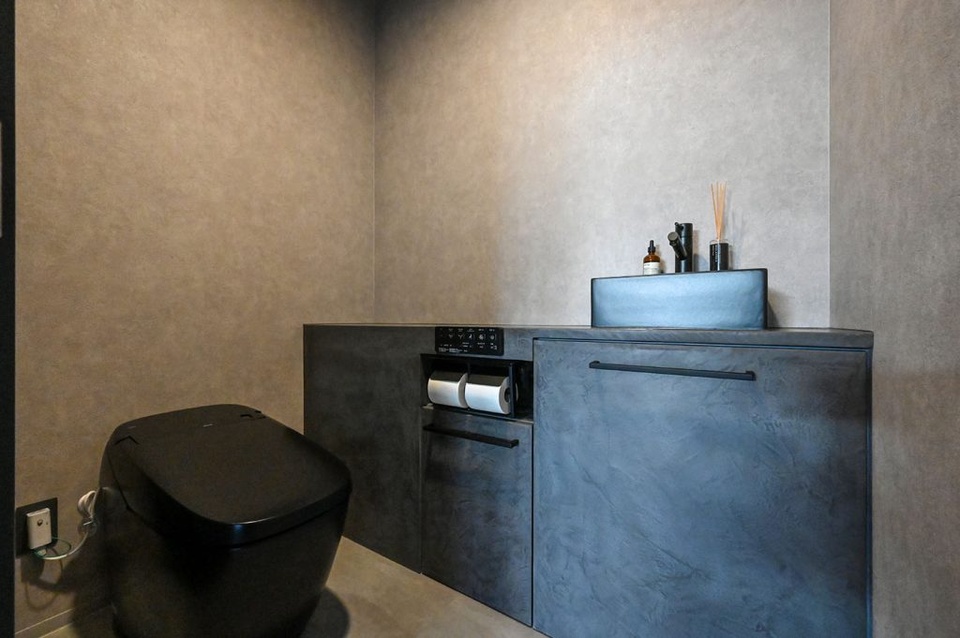 トイレの棚なども中井さんに作ってもらいました。小山内建設さんは、契約して工事が始まって、その後になって現場を見せてもらいながら、収納の場所や形、床材やクロス、照明などを現場で話し合いながら決めることができて、しかもあとで変更したいと相談したときでも快く対応してくれるので、なんでも相談できる、後悔のない家づくりができるのが大変嬉しかったですね。