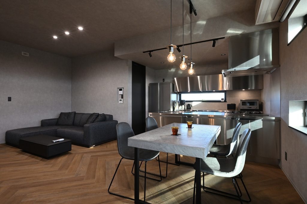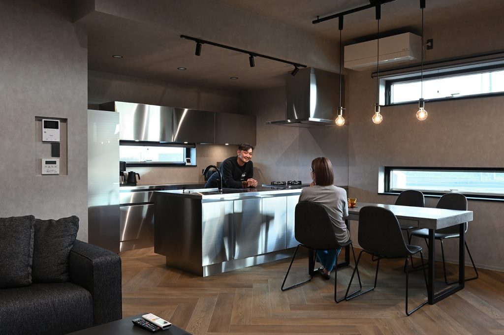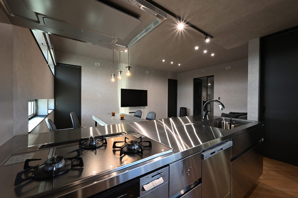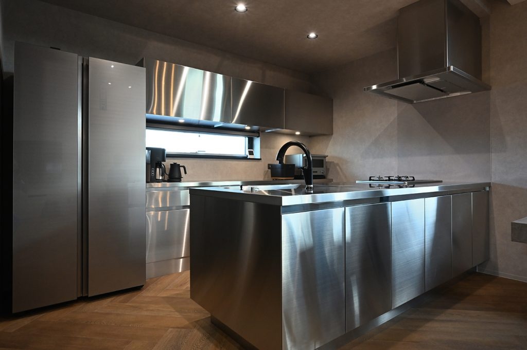キッチンも背面収納もオールステンレスを選びたくて、サンワカンパニーのGRAD45(グラッド45)を採用しました。デザインで選んだので気に入っています。指紋や多少の傷は付きます。建具もサンワカンパニーの製品を多数使っています。