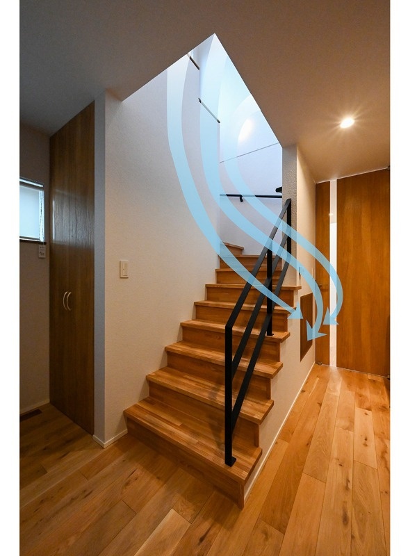1/1階の階段横に配置した壁ガラリ。2階から下りてくる空気を床下に戻し、上昇する空気とのバランスをとる役割を果たしている。