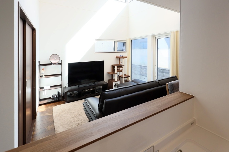 リビングは天井高約5.5mの大きな吹抜け設計。南西と南東の壁にワイドな窓を配しています。「ちょうどお月さまが窓から見えて、とても癒されます」と奥さま。