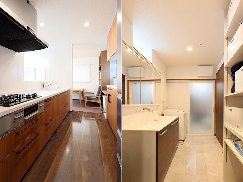 キッチンから洗面脱衣室、ホールへと回遊できます。洗面化粧台は幅120センチのワイドサイズ、シンクは人造大理石の一体成型でお掃除も楽々です。