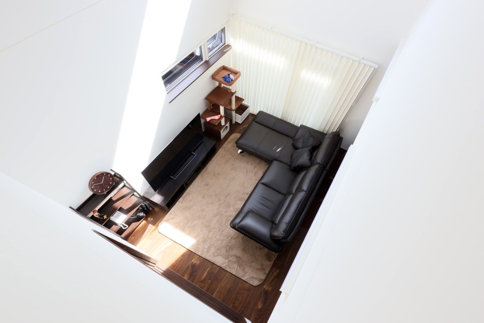 (1)3方向に家が建つ45坪の住宅地という立地に配慮した吹抜けのリビング