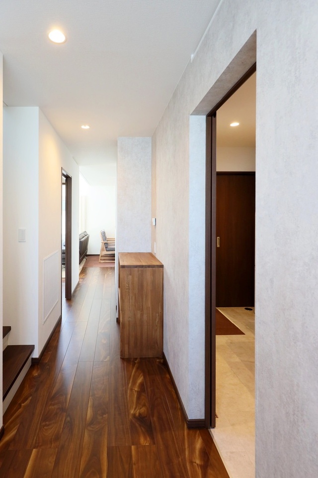 玄関からリビング方向を眺めたホール。LDKとホールは傷や汚れに強いフローリングを採用しています。右は洗面脱衣室で、LDKとホールを通りグルリと回遊できる生活動線。