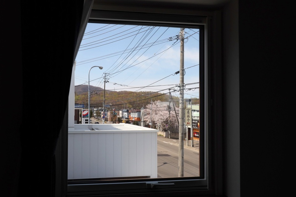 寝室は2面採光、大きな窓から見えるのがこの風景。隣の住宅は玄関部分が1階のみの下屋となるため、遠くの山まで視界が抜けています。