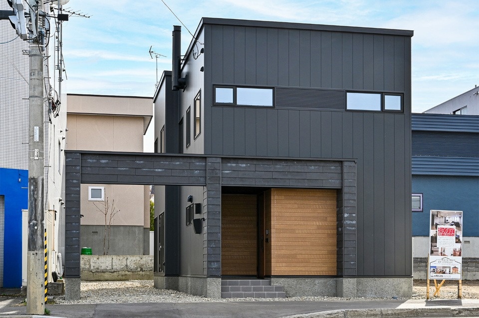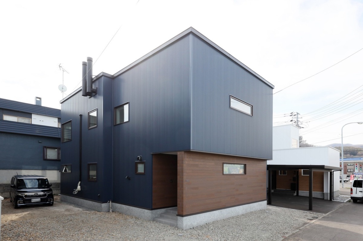 外観はグランブルーの金属サイディングに加え、木目調ミディアムブラウンの窯業系サイディングを1階ポーチ部分にアクセントとして採用。落ち着いた雰囲気の中に個性が映える住まいです。