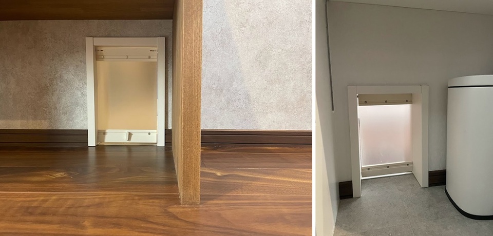 猫も大切な家族のT邸。左は玄関ホールの棚下に仕込んだ猫ドア、右は洗面脱衣室側から見た猫ドアです。「壁の下から突然、猫が出て来たら面白いでしょ」と遊び心が楽しい設計。