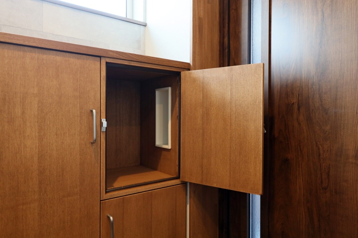 靴収納内に設けた郵便受けの気密ボックス。隙間風が全く入らないように作られています。