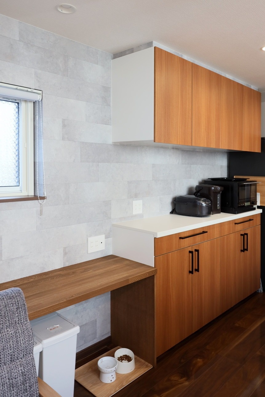 ダイニングの造作棚とキッチンの食器棚の間には造作のカウンターを設置。カウンター下は猫ちゃんの食事コーナーになっています。