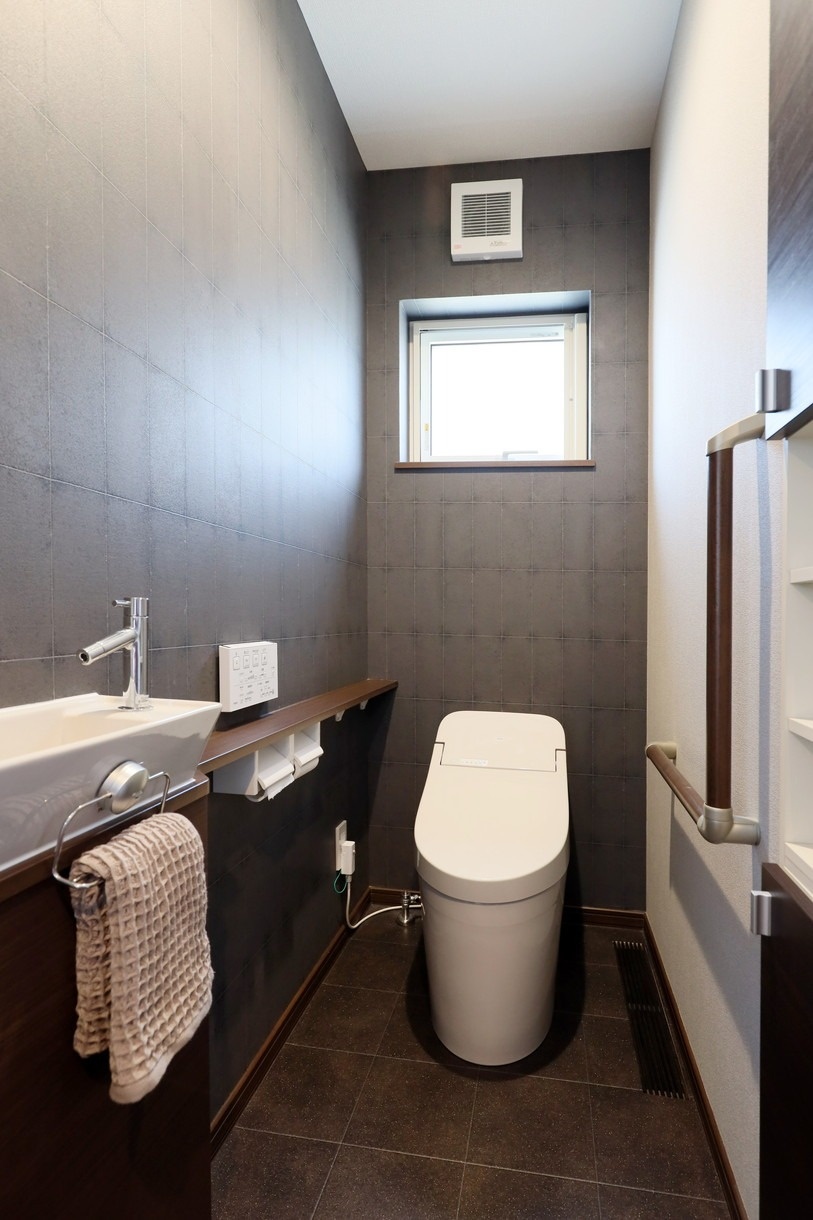 床面の黒いタイル調のクッションフロア―、壁面の織物調と石目調のクロス、手洗いカウンターなどこだわり満載の1階トイレ。