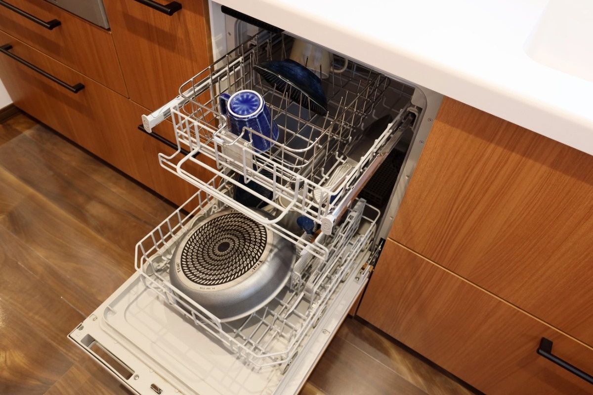 キッチンには、手前に大きく開閉する海外様式の食洗機を組み込んでいます。「フロントオープンタイプの食洗機が絶対欲しくて」。このオーダーに、戸村さんが見つけたのは国産唯一のフロントオープンタイプを手掛けるリンナイの食洗機でした。