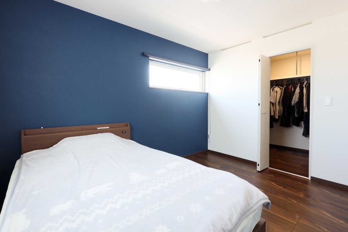 7畳の寝室。アクセントクロスは奥さまお気に入りのネイビー。ウォークインクロゼットは、3.4畳の大容量サイズです。