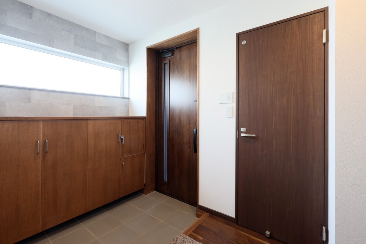 大型の造作靴収納が配された玄関。ご主人愛用の傘がロングサイズで、既製品では収納できなかったため、傘のサイズに合わせて造作したオリジナルの靴収納です。玄関床のタイル下には床暖房を施工しています。