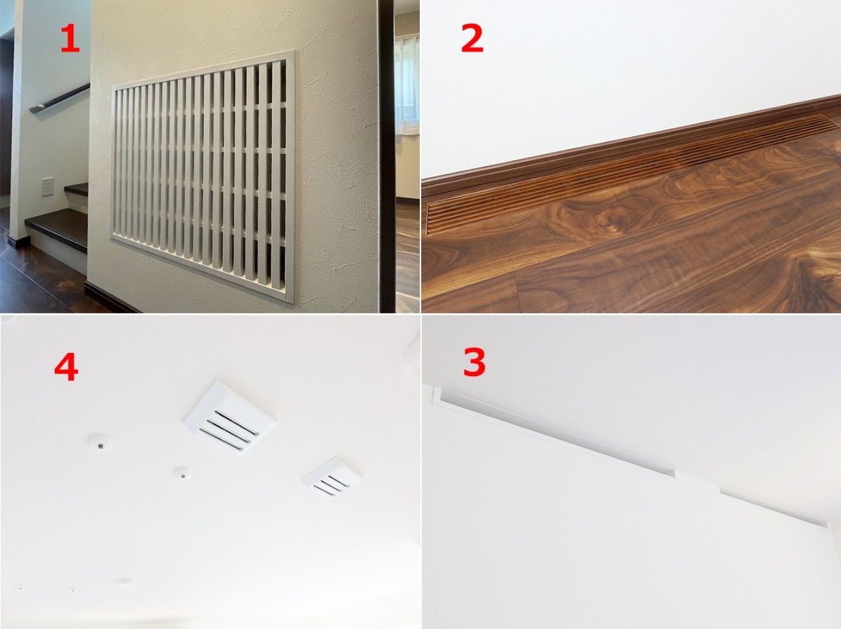 2/2階の床ガラリ。床下から壁の中を上がってくる暖かい空気がここから室内へ。