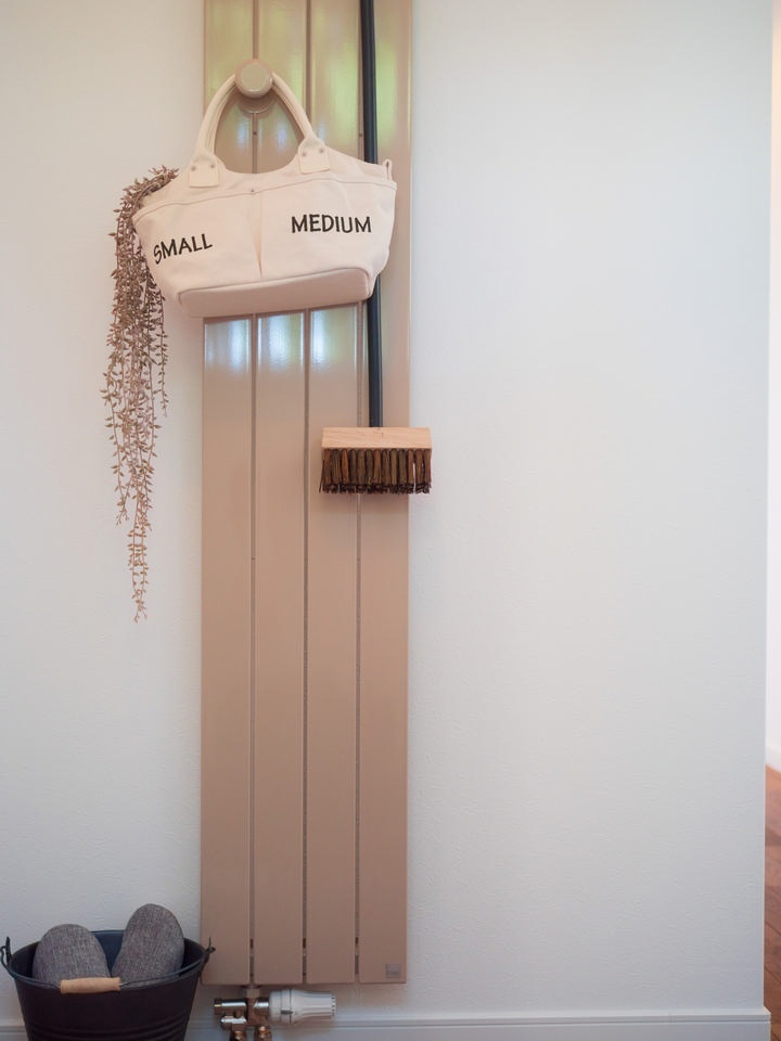 玄関の暖房パネルにはスモーキーカラーをチョイス。さり気なく下げてある雑貨との相性もばっちりです。