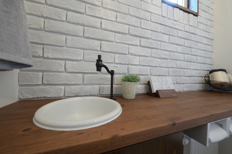 1階トイレは、まさにカフェの趣たっぷり。壁面には本物のタイルを使用、窓には木枠を採用したこだわりの空間。レトロな水栓もポイントになっています。