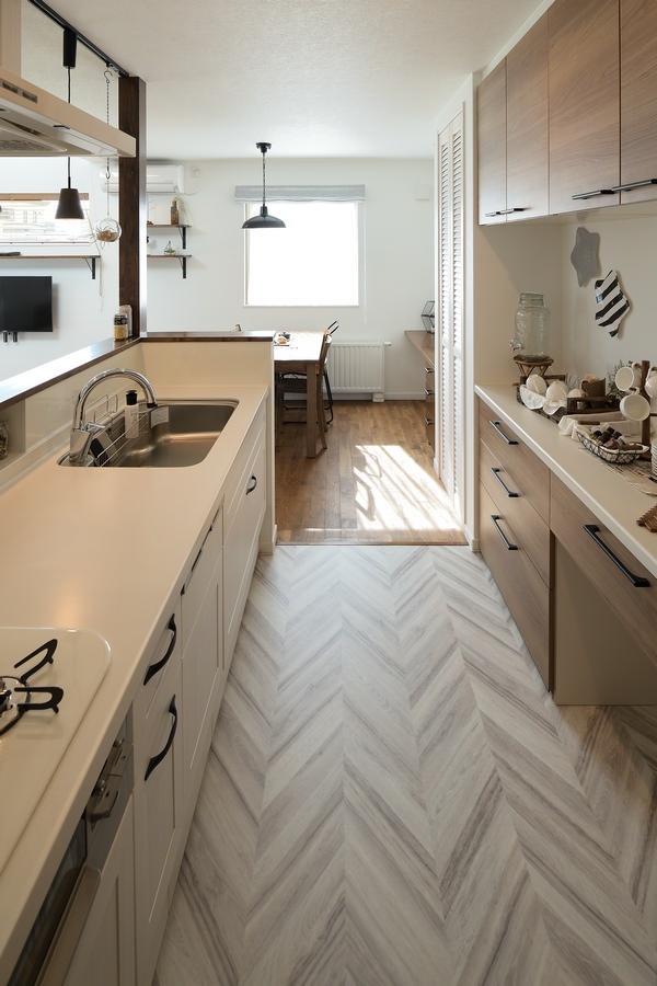 1階のダイニングとキッチンは配膳がしやすい横並び。作業効率が良く、子どもがお手伝いをしやすい造りです。ヘリンボーン柄がおしゃれな床材は耐水・耐久性に優れた複層ビニル床塩ビシート。男性もキッチンに立つ時代、家族みんなで気兼ねなく作業ができそうです。