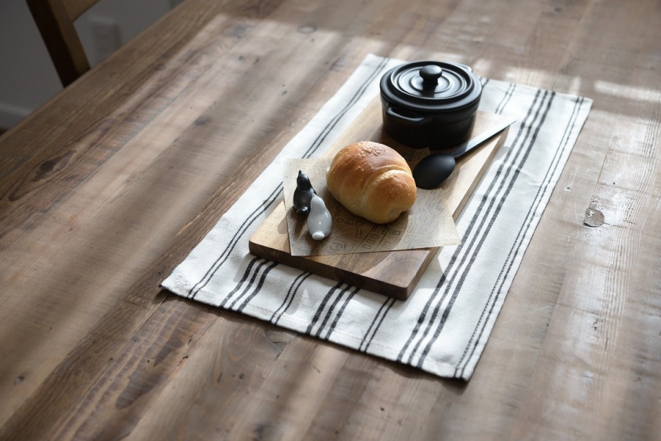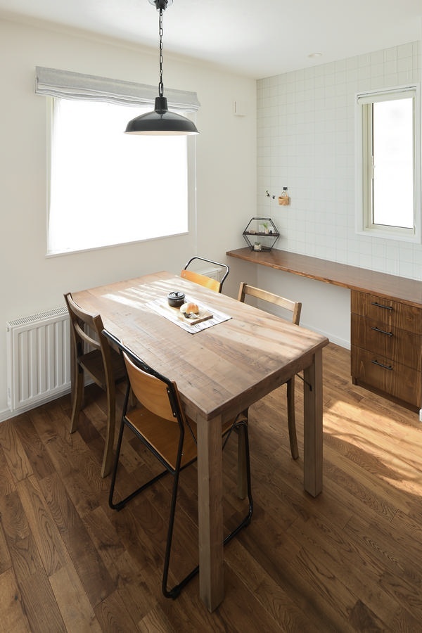 ダイニングには古材を利用したテーブルセットが鎮座。家の雰囲気に合わせ、こうした家具も求めやすい価格で提案してくれるそう。壁面の引き出し付き作業カウンターは造作によるオリジナル。家族みんなで様々な使い方ができそうです。