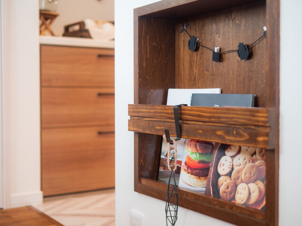 キッチン台の袖壁を利用したマガジンラックもイネスホームのオリジナル。こちらは要望が多い人気アイテム。