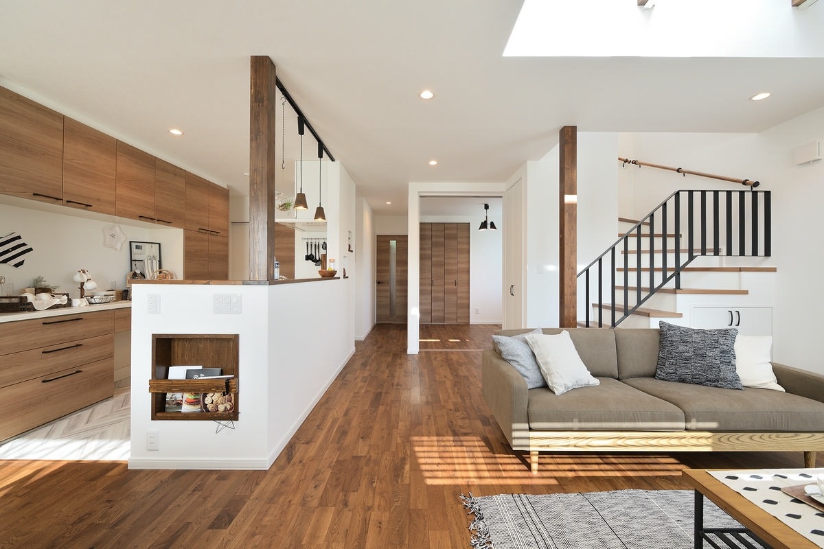 1階の吹き抜けリビングは、上下階でも家族の気配を感じられる造りが魅力。リビング階段にはシンプルなアイアンの手摺をセレクト。「ただいま」の声だけではなく、家族の行き来を見守ることができる。イネスホームが大切にしている家族をつなげる家の形です。
