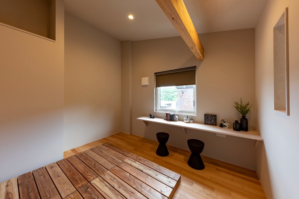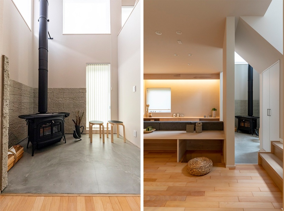 薪ストーブのある土間や、国産イグサの本畳が敷かれた床下収納付きのタタミコーナーも印象的。佇まいの美しさ、暮らしの楽しみ、そして快適な環境と、すべてがデザインされた住宅でした。