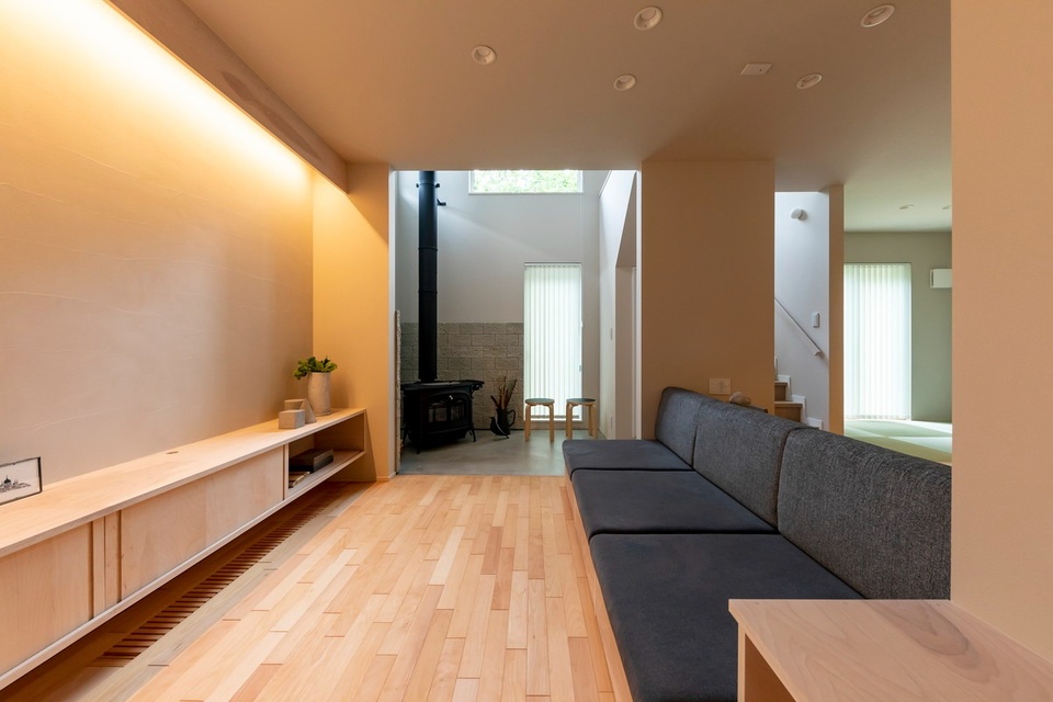 ソファー正面の壁は珪藻土の塗り壁になっており、凹凸が間接照明によってきれいなニュアンスを生んでいます。
